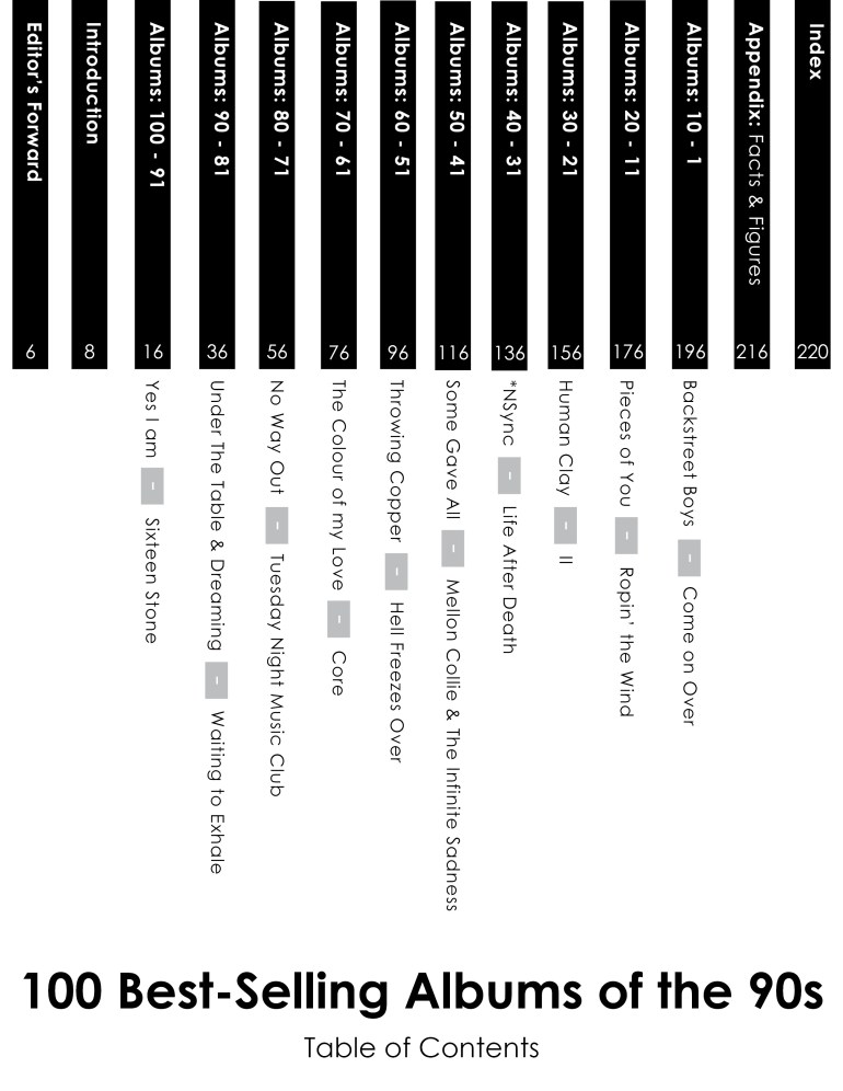 **Table of Contents was created for book titled “100 Best-selling Albums of the 90s” by Peter Dodd, Justin Cawthorne and Dan Auty.